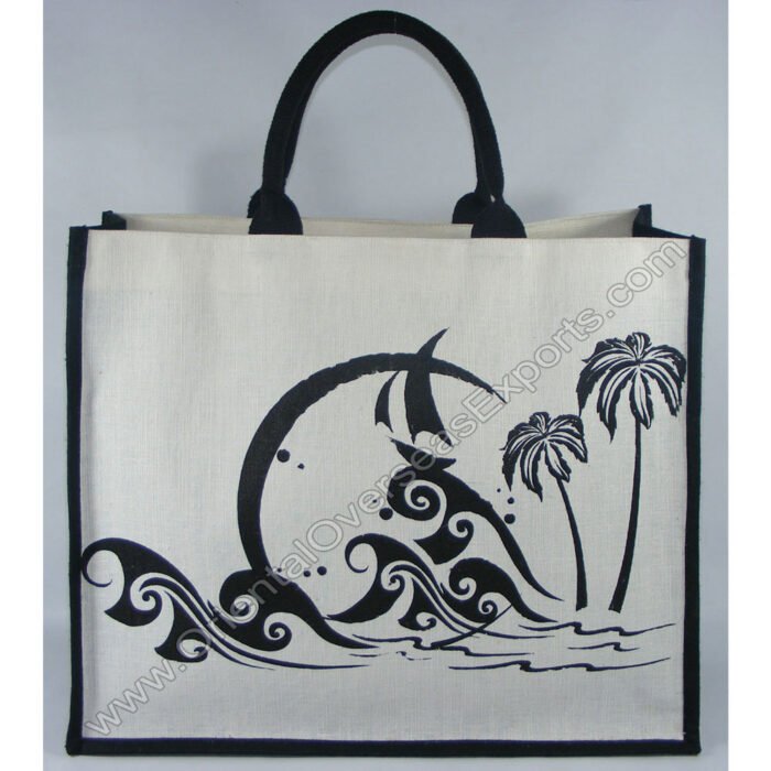 Elegant looking printed jute cotton beach bag with lamination inside # 2219 along with padded cotton web handles (padded with rope inside).
